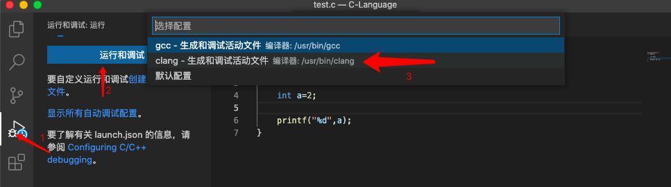 选择左侧的【运行和调试】,选择环境【C++(GDB/LLDB)】,【gcc】