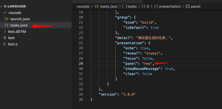 在文件夹中出现了【tasks.json】,在文档中加上presentation,其中的panel属性可以用shared和new,shared表示终端共享使用,new的话就是再建一个终端来显示