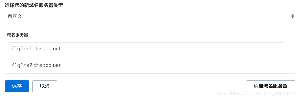 定位到域名服务器添加域名服务器f1g1ns1.dnspod.net,f1g1ns2.dnspod.net保存