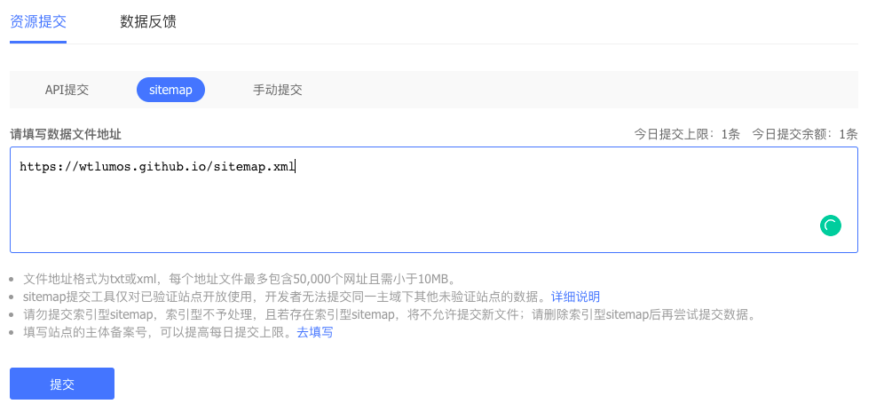 2、API提交和手动提交共享配额,每日至多提交10万条有价值的内容,sitemap提交配额不与其他方式共享,具体配额以站点页面显示数据为准 。配额不可累计,当日有效。