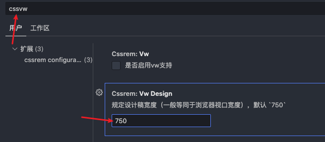 打开设置,在搜索设置中直接输入cssvw,把750更改为自己想要的