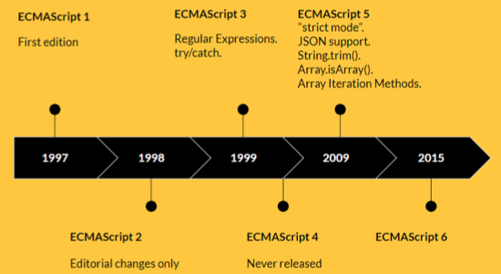 | 第6版 | 2015 | 模块化、面向对象语法、 Promise、箭头函数、let、 const、数组解构赋值等等 |