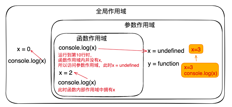 当函数得到参数有默认值时,会形成一个新的作用域,这个作用域用于保存参数的值