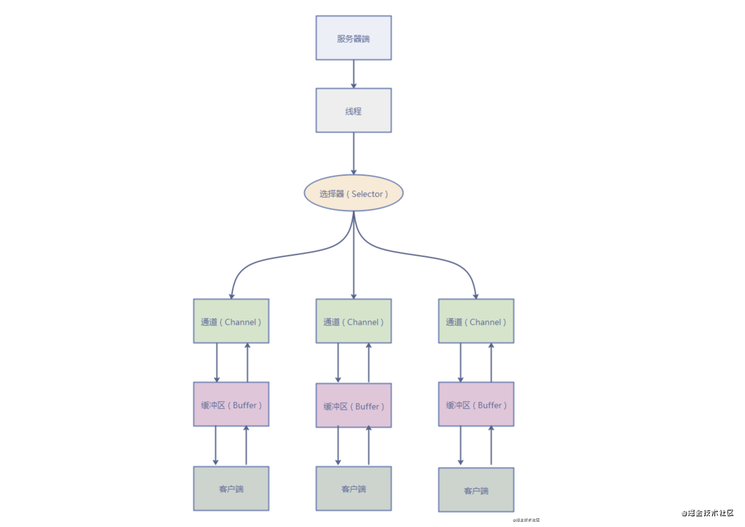 Buffer 缓冲数组,发送到Channel的数据先放入Buffer中,从Channel中读取的数据也先放入Buffer中。