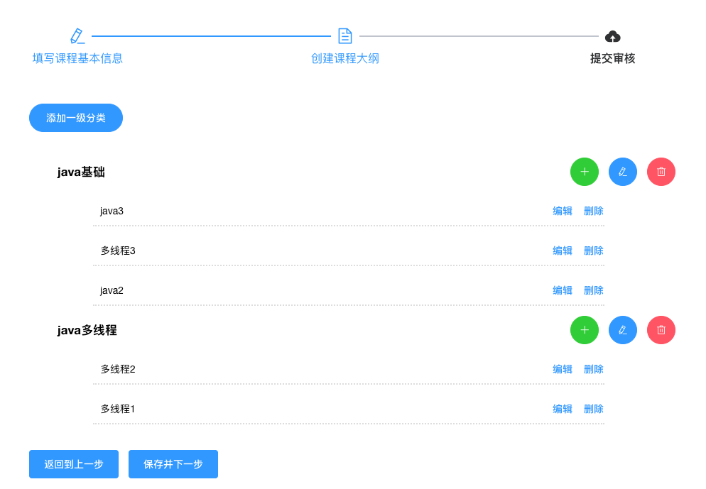 | <ul class="chapterList"> <li v-for="chapter in chapterList" :key="chapter.id"> <p> <strong>{{chapter.title}}</strong> <span class="acts"> <el-tooltip content="添加课时" placement="top" effect="light"> <el-button type="success" icon="el-icon-plus" circle v-on:click="insertVideo(chapter.id)"></el-button> </el-tooltip> <el-tooltip content="修改信息" placement="top" effect="light"> <el-button type="primary" icon="el-icon-edit" circle @click="updateChapter(chapter.id)"></el-button> </el-tooltip> <el-tooltip content="删除章节及课时" placement="top" effect="light"> <el-button type="danger" icon="el-icon-delete" circle @click="deleteChapter(chapter.id)"></el-button> </el-tooltip> </span> </p> <ul class="chapterList videoList"> <li v-for="video in chapter.children" :key="video.id"> <p>{{video.title}} <span class="acts"> <el-button type="text" @click="updateVideo(video.id)">编辑</el-button> <el-button type="text" @click="deleteVideo(video.id)">删除</el-button> </span> </p> </li> </ul> </li> </ul>