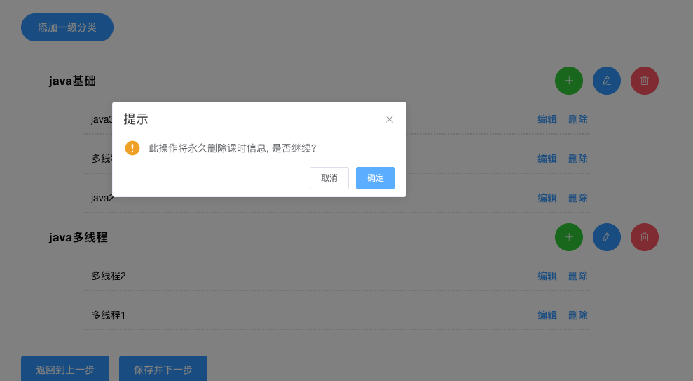 | <script> deleteVideo(id){ this.$confirm('此操作将永久删除课时信息, 是否继续?', '提示', { confirmButtonText: '确定', cancelButtonText: '取消', type: 'warning' }) .then(() => { //return 后then方法才会执行 return video.deleteVideoById(id) }) .then(response => { //重新所有分类 this.getChapterList(this.courseId) this.$message({ type: 'success', message: response.message })