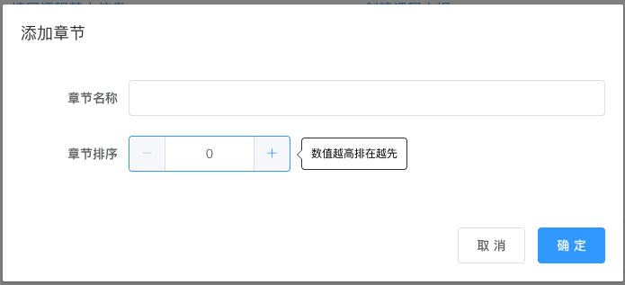 <!-- 章节表 --> <el-dialog title="添加章节" :visible.sync="chapterFormVisible" :show-close="false"> <el-form :model="chapterObj"> <el-form-item label="章节名称" :label-width="formLabelWidth"> <el-input v-model="chapterObj.title" autocomplete="off"></el-input> </el-form-item> <el-form-item label="章节排序" :label-width="formLabelWidth"> <el-tooltip content="数值越高排在越先" placement="right" effect="light"> <el-input-number :min="0" v-model="chapterObj.sort" /> </el-tooltip> </el-form-item> </el-form> <div slot="footer" class="dialog-footer"> <el-button @click="cancel">取 消</el-button> <el-button type="primary" @click="saveOrUpdateChapter">确 定</el-button> </div> </el-dialog>
