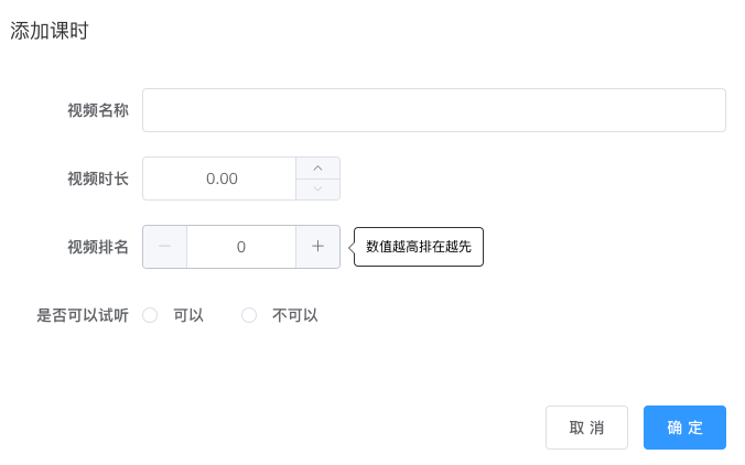 | <!-- 课时表 --> <el-dialog title="添加课时" :visible.sync="videoFormVisible" :show-close="false"> <el-form :model="videoObj"> <el-form-item label="视频名称" :label-width="formLabelWidth"> <el-input v-model="videoObj.title"/> </el-form-item> <el-form-item label="视频时长" :label-width="formLabelWidth"> <el-tooltip content="按0.02秒递增" placement="right" effect="light"> <el-input-number v-model="videoObj.duration" :min="0" :precision="2" controls-position="right" step="0.02" placeholder="00:00"/> 秒 </el-tooltip> </el-form-item> <el-form-item label="视频排名" :label-width="formLabelWidth"> <el-tooltip content="数值越高排在越先" placement="right" effect="light"> <el-input-number v-model="videoObj.sort" :min="0" /> </el-tooltip> </el-form-item> <el-form-item label="是否可以试听" :label-width="formLabelWidth"> <el-radio v-model="videoObj.isFree" :label="false"> 可以</el-radio> <el-radio v-model="videoObj.isFree" :label="true"> 不可以</el-radio> </el-form-item> </el-form> <div slot="footer" class="dialog-footer"> <el-button @click="videoCancel">取 消</el-button> <el-button type="primary" @click="saveOrUpdateVideo">确 定</el-button> </div> </el-dialog>