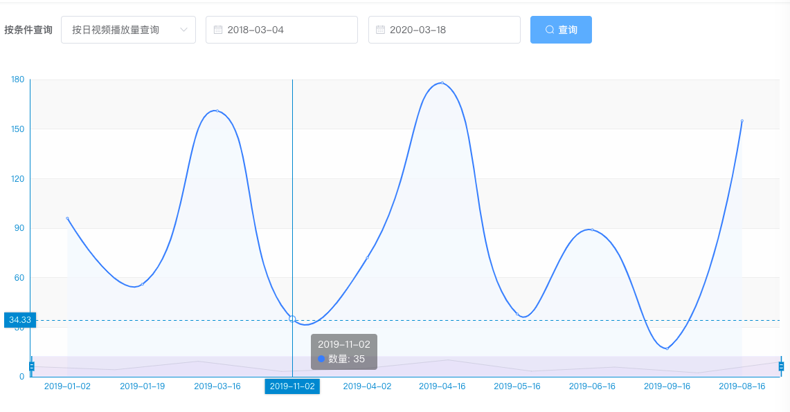 | <template> <div class="app-container"> <el-form :inline="true" class="demo-form-inline"> <el-form-item label="按条件查询"> <el-select v-model="searchObj.type" clearable placeholder="请选择查询类型"> <el-option value="register_num" label="按日注册人数查询"/> <el-option value="login_num" label="按日登录人数查询"/> <el-option value="video_view_num" label="按日视频播放量查询"/> <el-option value="course_num" label="按日新增课程数查询"/> </el-select> </el-form-item> <el-form-item> <el-date-picker placeholder="请选择开始时间" type="date" value-format="yyyy-MM-dd" v-model="searchObj.begin"/> </el-form-item> <el-form-item> <el-date-picker placeholder="请选择结束时间" type="date" value-format="yyyy-MM-dd" v-model="searchObj.end"/> </el-form-item> <el-form-item> <el-button type="primary" icon="el-icon-search" @click="showChart">查询</el-button> </el-form-item> </el-form> <div class="chart-container"> <div id="chart" class="chart" style="height:500px;width:100%;margin-right:50px"/> </div> </div> </template>