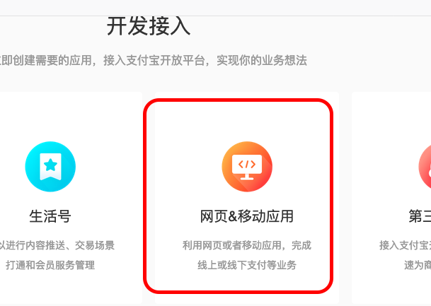 支付宝扫码登录后,进入网页和应用开发,创建一个新应用