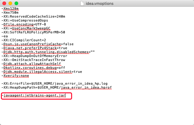 在idea.vmoptions中最后添加-javaagent:jetbrains-agent.jar
