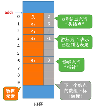 每个数据元素4B,每个游标4B(每个结点共 8B) 设起始地址为 addr,e1的存放地址为 addr + 8*2