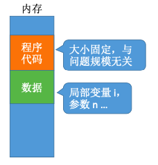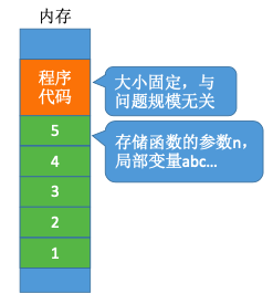无论问题规模怎么变,算法运行所需的内存空间都是固定的常量,算法空间复杂度为S(n) = O(1) S 表示 “Space”