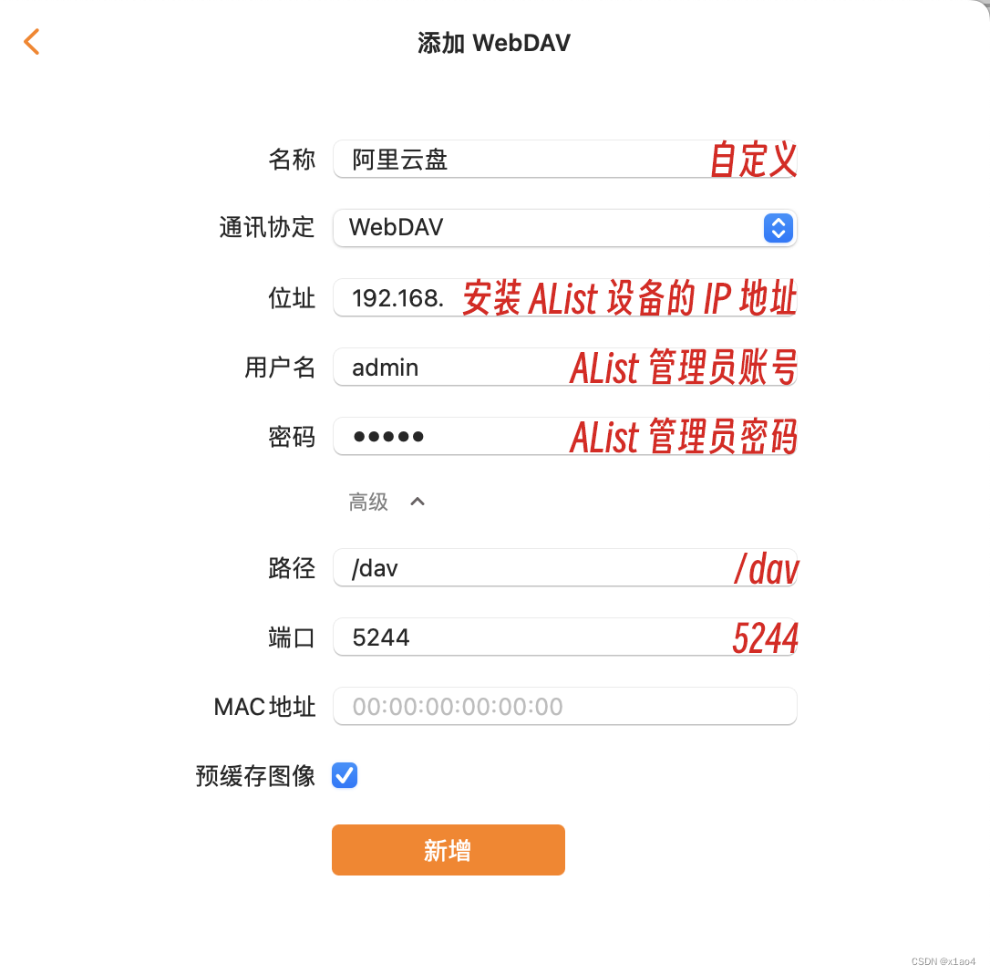 在 Infuse 中依次点击【文件 - 新增文件来源 - 添加 WebDAV】,参考下图输入自己的 AList 相关信息,点击【新增】即可连接成功