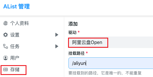 点击【存储】标签,点击【添加】,选择【阿里云盘Open】